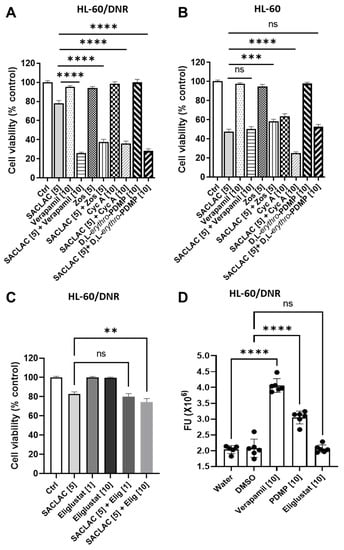 It is well established that inhibition of P-gp function can limit ceramide glycosylation, and because the inhibitor regimen demonstrated efficacy in drug-resistant, P-gp-expressing AML models, we sought to assess the role of P-gp in this process. To investigate this possibility, we utilized D,L-erythro-PDMP, an inactive isomer of D-threo-PDMP [25], that does not inhibit GCS but can limit ceramide glycosylation via modulation of P-gp function [7,8,26]. Results show that the inactive form of PDMP, the D,L-threo, while not cytotoxic alone, heightened the SACLAC effect in HL-60/DNR cells (Figure 4A, far right). For example, viability was nearly 80% with 5 µM SACLAC, 100% with 10 µM D,L-erythro-PDMP, and 32% with the combination, a clear enhancement. Similarly, in HL-60/VCR cells, viability was 80% with SACLAC exposure, 102% with D,L-erythro-PDMP exposure, and 38% with the combination (investigators laboratory). To further position the participation of P-gp as a player, we tested cyclosporin A, a commonly employed ABC transporter antagonist [27,28], verapamil, another classic P-gp antagonist, and zosuquidar, a high-affinity P-gp antagonist. The data in Figure 4A show that although all were nontoxic alone, all were beneficially coactive when partnered with SACLAC. Thus, combinatorial SACLAC plus P-gp antagonist phenocopied the synergistic cytotoxicity imparted by SACLAC and D-threo-PDMP. Importantly, in P-gp naïve HL-60 cells, neither D,L-erythro-PDMP nor any of the P-gp antagonists showed enhanced cytotoxicity when partnered with SACLAC (Figure 4B). As an example, SACLAC plus verapamil yielded a cytotoxic response identical to SACLAC alone. Of note, some of the agents yielded significant differences when partnered with SACLAC compared to single agents; however, the trend was in the anti-apoptotic direction. These data suggest that P-gp participates in driving ceramide-orchestrated cytotoxicity imparted by the combination of SACLAC and D-threo-PDMP. Interestingly, we assessed the clinically approved, highly specific inhibitor of GCS, eliglustat [29], effective at nM concentrations [30], with SACLAC in HL-60/DNR cells and found poor combination benefit at both 1.0 and 10 µM (Figure 4C). In order to determine if this lack of activity was due to poor affinity of eliglustat for P-gp, eliglustat was evaluated in rhodamine trapping assays. Rhodamine, a P-gp substrate, is actively pumped by P-gp; this action is blocked in the presence of P-gp antagonists. As shown in Figure 4D, intracellular rhodamine fluorescence was greatly enhanced by verapamil, serving as a positive control, and by D-threo-PDMP; however, the effect of eliglustat was without consequence, suggesting that, unlike D-threo-PDMP, eliglustat does not block P-gp function in HL-60/DNR cells. In summary, these studies demonstrate that P-gp is a prime target for countering ceramide glycosylation to enhance the “ceramide response”.