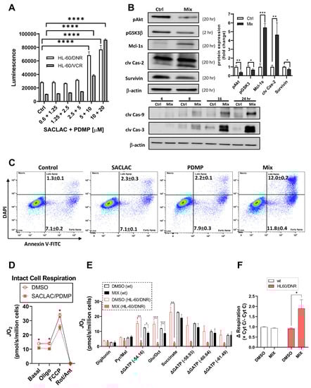 Signaling events underlying cytotoxic responses to the SL enzyme inhibitor combination were evaluated first by employing assays to mark possible caspase involvement. As shown in Figure 5A, treating either HL-60/DNR or HL-60/VCR cells in combination with SACLAC and D-threo-PDMP (1:2 molar ratio) resulted in dose-dependent increases in caspase-3/7 activity. Of note, background constitutive caspase activity was three-fold higher in HL-60/DNR cells compared to the VCR-resistant model. Confirmation of caspase activation was made by immunoblot assays; time-dependent increases (4–24 h) in cleaved initiator caspase-9 and cleaved executioner caspase-3 occurred with exposure to the SACLAC D-threo-PDMP regimen (Figure 5B, bottom). Cleavage of caspase-2, an initiator caspase upstream of mitochondria, was also demonstrated (Figure 5B, top left). In addition, exposure to the inhibitor mix promoted inhibition of Akt activation, shown by decreased pAkt levels, and activation of GSK-3β, shown by decreased levels of pGSK-3β, connoting GSK-3β involvement in ceramide-induced mitochondrial apoptosis. Increased expression of pro-apoptotic Mcl-1S, the splice variant of anti-apoptotic Mcl-1L, the predominant form in many cancers, was also shown (Figure 5B, left). Lastly, we demonstrate a small but significant decrease in survivin expression upon exposure to the mix. Protein quantitation is shown in Figure 5B, right. Flow cytometry using Annexin V binding was used to affirm cellular apoptosis. As in the caspase assay (Figure 5A), control HL-60/DNR cells were stressed, as evidenced by the high background in early and late apoptosis (Figure 5C, Control). When the background is taken into account, the results demonstrate that whereas single agents imparted slight, if any, increases in Annexin V binding (early and late apoptosis), the combination (Mix) synergistically increased apoptosis after only a 24 h exposure. The intrinsic pathway of apoptosis intervenes at mitochondria and impacts mitochondrial function. An additional mechanism of action led us to interrogate mitochondrial bioenergetics, especially considering the titanic increases in ceramides resulting from SACLAC D-threo-PDMP exposure. To evaluate the impact of the drug combination on mitochondrial respiration, both HL60 wt and HL60/DNR were exposed to the drug combination. Following a 24 h exposure, mitochondrial respiratory kinetics were assessed in both intact and digitonin-permeabilized cells (Figure 5D,E). Relative to DMSO control, both basal and maximal respiration in intact cells was decreased by the inhibitor mix in HL60/DNR cells (Figure 5D). Interestingly, upon digitonin permeabilization, HL60/DNR cells treated with the mix were completely refractory to respiratory stimulation (Figure 5E). Specifically, despite no change in respiration in the presence of either digitonin alone or saturating pyruvate/malate, direct stimulation of oxidative phosphorylation (OXPHOS) revealed a complete inability of HL60/DNR cells to respond to the OXPHOS stimuli (Figure 5E). Lowered permeabilized cell respiration in response to SACLAC D-threo-PDMP was independent of both the carbon substrate supplied (i.e., similar OXPHOS deficiency in the presence of pyruvate/malate, glutamate/octanoyl-carnitine, and succinate), as well as the ATP resynthesis demand state (Figure 5E). In permeabilized cells assays, exogenous cytochrome C increased respiration only in HL60/DNR exposed to the combination of SACLAC D-threo-PDMP, consistent with outer-membrane loss of integrity (Figure 5F). Interestingly, the SACLAC D-threo-PDMP drug combination had minimal effects in HL60 wt cells, consistent with our observations of maintained viability in HL60 wt cells upon administration of the SACLAC D-threo-PDMP combination.