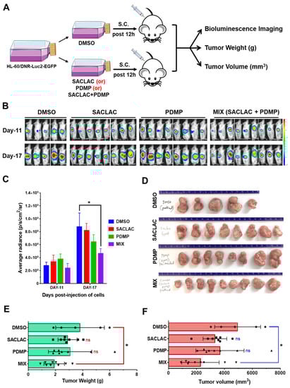 Exposure of HL-60/DNR cells to combination SACLAC D-threo-PDMP ameliorated tumor progression in vivo. (A) HL-60/DNR-Luc2-EGFP cells were treated in vitro with either SACLAC (5 µM), D-threo-PDMP (10 µM), or the mix for 12 h; controls were treated with vehicle (DMSO). An equal number of viable cells (2.5 × 106) from control and treatment groups (cell viability did not differ after 12 h pretreatment) were injected subcutaneously (s.c.) into 7–9 wk old male NRG-S mice (5–9 animals/group), and tumor progression was monitored by bioluminescence imaging (BLI), measurement of tumor weight (gm), and tumor volume (mm3). (B) BLI Images of mice on indicated days post-injection of pretreated HL-60/DNR-Luc2-EGFP cells injected s.c. (C) Quantification of BLI signals as average radiance (p/s/cm2/sr) for different treatment groups on indicated days. * p < 0.05 denotes statistical significance compared to the DMSO group by two-way ANOVA (Dunnett’s multiple comparisons test). (D), The tumors were harvested from different treatment groups for gross examination of tumor sizes. (E,F) Average tumor weight and tumor volume in different experimental groups were compared for statistical differences by one-way ANOVA (Tukey’s multiple comparisons test) * p < 0.05 was considered significant compared to the vehicle DMSO group.
