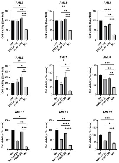 Combination SACLAC D-threo-PDMP treatment effectively reduces viability in primary de novo AML patient samples. Cell viability in a cohort of nine primary, previously untreated, de novo, AML patient PBMC samples treated with control (DMSO), SACLAC (5 μM), and/or PDMP (20 μM) for 48 h. Cell viability was measured using the CellTiter Glo luminescence assay. Luminescence was normalized to DMSO control treatment, which was set to 100%. Error bars represent the SD of three technical replicates. An unpaired t-test with Welch’s correction was used for statistical analysis (*, p < 0.05; **, p < 0.01; ***, p < 0.0005, ****, p < 0.0001). ns, not significant.