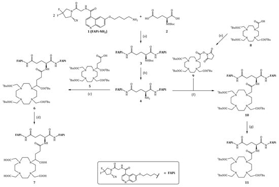 The synthesis of DOTAGA.Glu.(FAPi)2 7 and DO3A.Glu.(FAPi)2 11 is shown in Figure 2 and was started from FAPi-NH2 1 and Boc-Glu-OH 2.