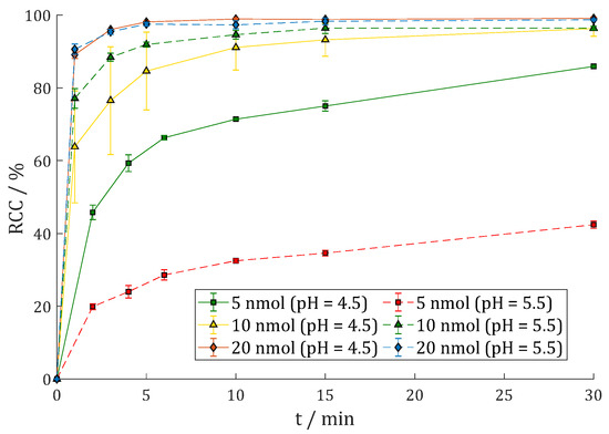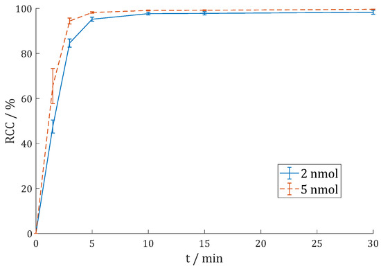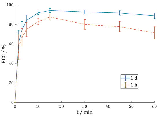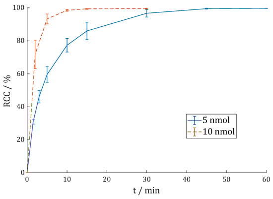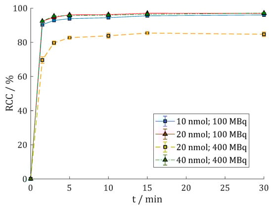 Reaction kinetics (radiochemical conversion (RCC) in %) of [68Ga]Ga-DOTAGA.Glu.(FAPi)2 68Ga-7 in 1 M HEPES (pH = 4.5) at 95 °C with 100 MBq 68Ga (n = 4) or 400 MBq 68Ga (n = 2).