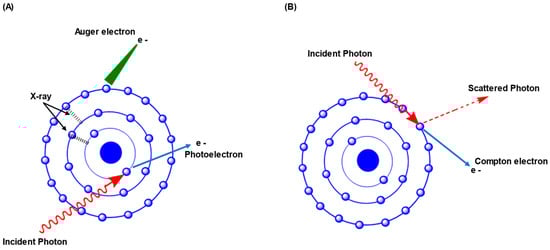 NP interaction with ionizing radiation. (A) The collision of incident photons with inner orbital electrons causes a photoelectric effect. The inner electron absorbs photon energy and ejects it as a photoelectron. Due to the ejection of photoelectrons, electrons from outer shell fill the gap resulting in the emitting of X-rays or the Auger electron. (B) On the other hand, the collision of incident photons with outer orbital electrons causes the Compton effect. The Compton electron absorbing photon energy is ejected from the atom, which may excite and ionize subsequent atoms. The photon loses a fraction of its energy and either continues on its course or is alternatively involved in further process, such as photoelectric effects or the Compton effect.