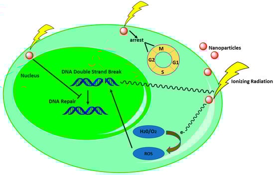 Ionization in combination with NPs brings about indirect necrosis or apoptosis via oxidation of biomolecules, including proteins, lipids, and DNA, along with mitochondrial dysfunction [7,83,84]. High-intensity ionizing radiation generates ROS, including superoxide anion radicals (O2−), hydrogen peroxide (H2O2), and hydroxyl radicals (•OH), through water radiolysis, and they interact with cellular biomolecules, leading to apoptosis/cellular death [7,85,86,87,88,89], as well as suppressing tumor progression [90]. Therefore, sufficient ROS production is crucial to mediate DNA damage, as well as suppress DNA repair (Figure 2).