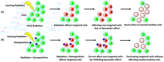 Radiation-induced bystander effects. (a) Irradiating cancer cells causes both targeted and non-targeted cell destructions. (b) Radiation along with NPs only kills tumor tissues, leaving the nearby healthy cells intact.