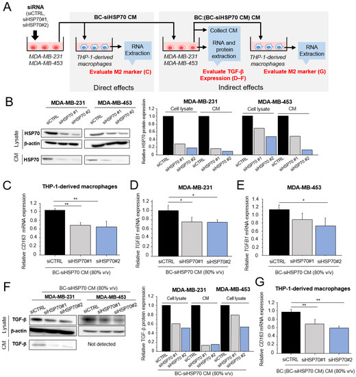 Direct or indirect effects of extracellular HSP70 from breast cancer cells on the pro-tumorigenic effects of macrophages. (A): Schematic image of experiments to investigate the direct or indirect effects of extracellular HSP70 on the pro-tumorigenic effects of macrophages in the present study. (B): HSP70 protein levels in cell lysate or CM from MDA-MB-231 and MDA-MB-453 cells transfected with HSP70-specific siRNA (siHSP70#1 and siHSP70#2). (C): Expression of CD163 mRNA in THP-1-derived macrophages treated with CM from MDA-MB-231 cells transfected with HSP70-specific siRNA (BC-siHSP70 CM, 80% v/v). (D,E): Expression of TGFB1 mRNA in MDA-MB-231 (D) and MDA-MB-453 (E) cells treated with BC-siHSP70 CM (80% v/v). (F): TGF-β protein levels in the cell lysate and CM from MDA-MB-231 and MDA-MB-453 cells treated with BC-siHSP70 CM (80% v/v). (G): THP-1-derived macrophages were cultured in CM from MDA-MB-231 cells treated with BC-siHSP70 CM (BC:(BC-siHSP70 CM) CM, 80% v/v), and the mRNA expression of CD163 was evaluated by real-time PCR. * p < 0.05, ** p < 0.01 vs. control (siCTRL). The data are presented as the mean ± S.D. (n = 3). BC: breast cancer, CM: conditioned medium. The uncropped blots are shown in Supplementary Materials.