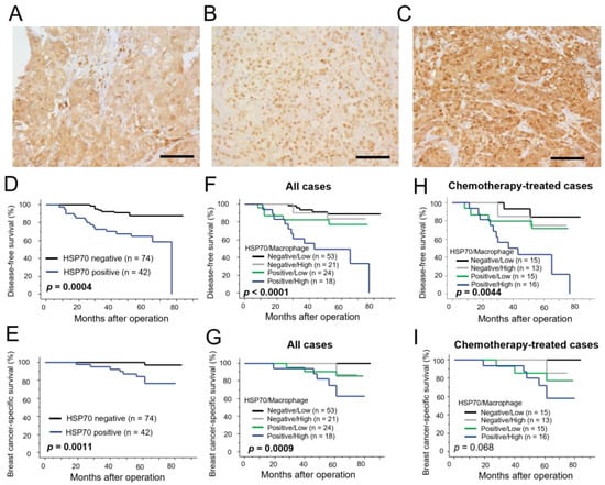 Immunohistochemistry for HSP70 in 116 breast carcinoma tissues. (A–C): Representative images of HSP70 immunostaining in the cytoplasm and nucleus of breast carcinoma cells (immunoreactivity of cytoplasm/nucleus = (A) positive/negative case; (B) negative/positive case; (C) positive/positive case). Bar = 100 μm. (D–I): Disease-free survival (D,F,H) and breast-cancer-specific survival (E,G,I) curves according to cytoplasmic HSP70 immunoreactivity breast carcinoma cells (D,E) or a combination of cytoplasmic HSP70 immunoreactivity and macrophage infiltration (F–I) in all patients ((D–G); n = 116) or in patients who had received adjuvant chemotherapy ((H,I); n = 59).
