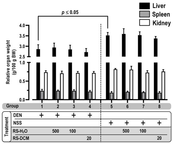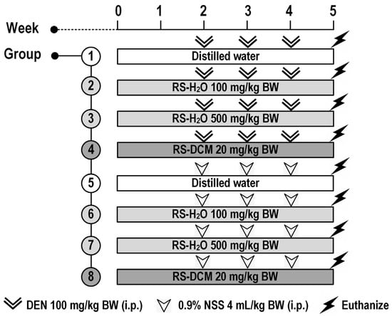 Male Wistar rats were randomly divided into 8 groups (8 rats per group, 64 total) and treated with the samples, as shown in Figure 1. Groups 1 to 4 were injected with DEN (100 mg/kg BW, intraperitoneal) at weeks 2, 3, and 4 to induce early-stage hepatocarcinogenesis. Groups 5 to 8 were injected with NSS (4 mL/kg BW, intraperitoneal) at weeks 2, 3, and 4. Group 1, as a positive control, received distilled water orally, whereas groups 2, 3, and 4 were given RS-H2O 100 mg/kg BW, RS-H2O 500 mg/kg BW, and RS-DCM 20 mg/kg BW, respectively, from week 0 until the end of the experiment (week 5). Group 5, as a negative control, was given distilled water (with 5% Tween-80) orally, while groups 2, 3, and 4 were fed RS-H2O 100 mg/kg BW, RS-H2O 500 mg/kg BW, and RS-DCM 20 mg/kg BW, respectively, from week 0 until week 5. Body weight and food/water intake were recorded twice a week. At week 5, all rats were euthanized by exsanguination from the abdominal aorta under isoflurane anesthesia. Whole blood was collected from abdominal veins for alanine transaminase (ALT) activity determination using a commercial kit (Olympus Corp., Tokyo, Japan). The internal organs were excised and weighed. The livers were maintained in 10% formalin, and three serial sections (4 µm thick) were prepared from each specimen. The first section was for histological examination with hematoxylin and eosin staining. The second section was used in immunohistochemistry and molecular analysis, as specified below. The remaining portion was kept at −80 °C for further analysis.