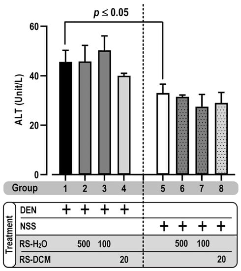 The toxicity of RS relevant to the experimental regimen was also observed. Rats were fed daily with RS-DCM (20 mg/kg) or RS-H2O (100 and 500 mg/kg) for 5 consecutive days, with or without DEN. The results show no significant effect of RS extracts on average body weight and food/water consumption compared with the positive control (DEN alone, group 1) or negative control (NSS alone, group 5) group (Table 5). For the vital organs, the relative spleen and kidney weight show no significant difference between the groups. In contrast, there is a significant decrease in liver weight between the DEN (group 1–4) and NSS (group 5–8) treatment groups, but no significant difference was observed between groups 1 to 4 and groups 5 to 8 (Figure 2). The data suggested that the liver weight reduction was contributed by DEN, a potent liver carcinogen, not RS. Since carcinogenic liver injury is one of the hepatocarcinogenic processes caused by DEN, the liver inflammatory marker alanine transaminase (ALT) was, therefore, measured to confirm our observations. DEN treatment increased liver inflammation compared with NSS treatment, as indicated by the increasing ALT activity. There was no difference between groups 1 to 4 and groups 5 to 8 (Figure 3). Our results indicated that liver injury was caused by DEN, not by RS. Moreover, the RS extracts have no effect on the observed vital organs during the treatment regimen.