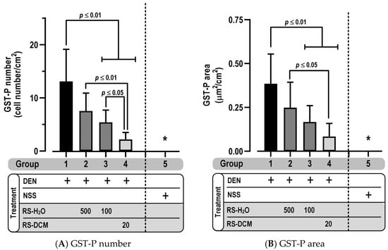 The effect of RS on hepatocarcinogenesis was determined from GST-P foci, a characteristic sign to indicate a preneoplastic lesion in the rat liver. Results showed that GST-P positive foci were observed after DEN administration, whereas NSS treatment found no positive trait. Co-administration of RS-H2O (500 mg/kg) or RS-DCM (20 mg/kg) with DEN significantly reduced GST-P positive foci expression (both GST-P number and area) (Figure 4A,B). It was evidence that RS extract potentially attenuated hepatocarcinogenesis.