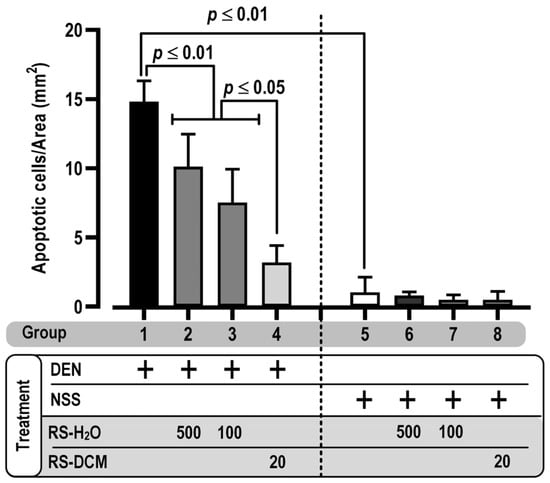 The effect of RS on hepatocarcinogenesis was determined from apoptotic cell death, a marker of carcinogenesis, using the TUNEL assay. DEN-treated rats displayed a significantly increased number of TUNEL-positive cells (apoptotic cells) in liver tissues than those with NSS treatment. RS treatment (RS-H2O and RS-DCM) lessened the apoptosis induced by DEN (Figure 5). Our result indicated the efficacy of RS in suppressing the progression of hepatocarcinogenesis.