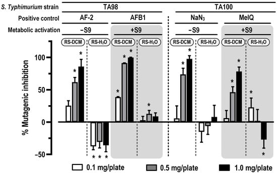 In vitro antimutagenic activity of RS in TA98 and TA100 strains of S. Typhimurium with non-metabolic (−S9) and metabolic (+S9) activation. The values are expressed as mean ± SD. The data were distributed normally (Shapiro–Wilk: p > 0.05) and were analyzed for statistical significance using one-way ANOVA with LSD’s post hoc test. * Significantly different from positive control (set as 0% mutagenic inhibition).