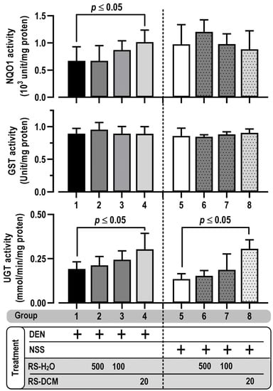 Phase II metabolizing enzymes play a central role in the detoxification of xenobiotics, carcinogens, and reactive oxygen species, attributed to carcinogenesis. Hepatic phase II enzyme activities, including UGT (UDP-glucuronyltransferase), GST (glutathione-S-transferase), and NQO1 (NADPH-quinone oxidoreductase) were, thus, determined in this study. Results showed no statistical difference between group 1 (DEN alone) and group 5 (NSS alone) based on the inhibition of phase II enzyme activities. RS-H2O treatment did not affect these enzyme activities. On the other hand, UGT and NQO1 activities were increased by RS-DCM co-treatment with DEN. The enhancement of UGT activities after RS-DCM treatment was also observed in the NSS co-treatment group (Figure 7). The data suggested that RS-DCM was more effective than RS-H2O in increasing phase II enzyme activities.