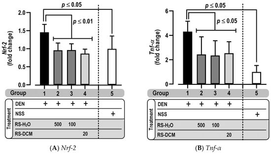Inflammation is an essential step in carcinogenesis. Pro-inflammatory cytokines such as NRF-2 (nuclear factor erythroid 2–related factor 2) and TNF-α (tumor necrosis factor-α) were, therefore, investigated in our study. DEN treatment increased rat liver inflammation, as indicated by the increased mRNA level of Nrf-2 (Figure 8A) and Tnf-α (Figure 8B). The overexpression, however, had been downregulated by RS-H2O and RS-DCM treatment. These results indicate the ability of RS extract to reduce liver inflammation, an important carcinogenic process.