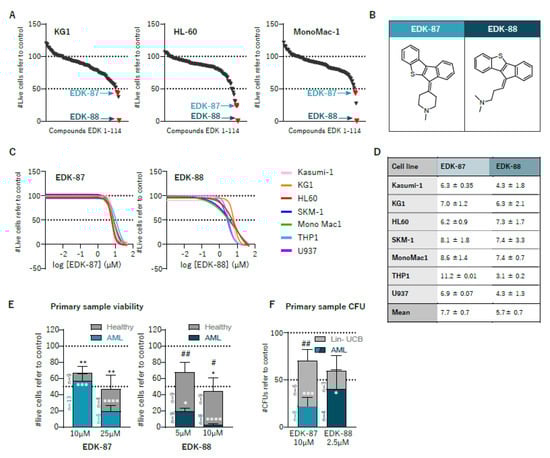 Identification of two hit compounds with antileukemic activity. (A) KG1, HL60, and MonoMac1 cells were treated with each of the 114 selected compounds in silico at 10 µM for 48 h, and cell viability was assessed with flow cytometry. (B) Chemical structure of EDK–87 and EDK–88. (C) AML cell lines treated with increasing concentrations of EDK–87 and EDK–88; cell viability was assessed, and (D) EC50 (µM) was calculated. (E) AML patient and healthy donor samples were treated with EDK–87 and EDK–88 at the indicated concentrations for 72 h, and cell viability or (F) clonogenicity was determined. Lin–UCB: lineage–depleted umbilical cord blood. * p < 0.05; ** p < 0.01; *** p < 0.001; **** p < 0.0001 in Kruskal–Wallis tests comparing to untreated control. # p < 0.05; ## p < 0.01 in Kruskal–Wallis tests comparing healthy and AML.
