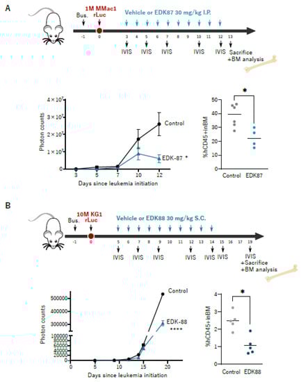 EDK–87 and EDK–88 are effective in vivo. (A) Adult conditioned NSG mice (4 mice/group) transplanted with 1 × 106 Rluc–transduced MonoMac1 cells, left untreated for 3 days, and then IP administered with 30 mg/kg EDK–87 for 10 consecutive days. Luminescence was analyzed at Days 3, 5, 7, 10, and 12, and photon counts are represented. On Day 12, mice were euthanized, and the engraftment in the bone marrow was assessed via flow cytometry. (B) Adult conditioned NSG mice (5 mice/group) transplanted with 10 × 106 rLuc–transduced KG1 cells, left untreated for 5 days, and then SC administered with 30 mg/kg EDK–88 for 10 consecutive days. Luminescence was analyzed at Days 5, 9, 12, 14, 16, and 19, and photon counts refer to luminescence at Day 5. On Day 19, mice were euthanized, and leukemic engraftment in the bone marrow was assessed with flow cytometry. Bus: busulfan. BM: bone marrow. Luminescence statistics: * p < 0.05, **** p < 0.0001, in two-way ANOVA. Flow cytometry statistics: * p < 0.05 unpaired t-test.