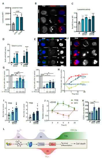 EDK–87 and EDK–88 induce lysosomal–dependent cell death. HL60 cells were treated with EDK–87 or EDK–88 at 10 µM for 24 h, stained with Lysotracker Green, and analyzed with (A) flow cytometry and (B) confocal microscopy (scale bar = 10 µm). (C) LysosomalMetriq–transduced HL60 cells were treated with the compounds at 5 and 10 μM for 24 h, and red/green fluorescence was measured with flow cytometry. (D) Gal3–GFP–transduced HL60 cells were treated with the indicated compounds at 10 and 20 µM for 24 h, and cells with galectin 3 puncta were counted via confocal microscopy. (E) Representative galectin 3 puncta images (scale bar = 10 µm). (F) HL60 cells loaded with dextran–rhodamine B were treated with EDK compounds at 10 µM for 24 h and analyzed via confocal microscopy (scale bar = 10 µm). (G) HL60 cells were cotreated with α–tocopherol (α–toco) at the indicated concentrations in the presence of 10 µM EDK–87 (left) or EDK–88 (right) for 48 h, and cell viability was assessed with flow cytometry. (H) HL60 cells were loaded with a Fura2 probe and treated with 10 µM EDK–87/EDK–88, 50 µM chloroquine (negative control), or 1 µM ionomycin (positive control). Fluorescence was recorded at the indicated time points. The ratio (340/508)/(380/508) is represented. (I) HEK293T cells were transiently transfected with a TFEB reporter vector, treated with 10 and 20 µM EDK–87 and EDK–88 for 24 h, and luminescence was measured. (J) HL60 cells were treated at the indicated times (h) with 10 µM EDK–88, and TFEB (green) and MYC (red) gene expression was assessed with real-time qPCR and normalized to time 0. (K) HL60 cells were treated with EDK–87/EDK–88 at 2.5 and 5 µM for 72 h, and surface CD11b expression was analyzed with flow cytometry. (L) Proposed mechanism for EDK–induced differentiation. * p < 0.05; ** p < 0.01; *** p < 0.001; **** p < 0.0001 in one–way ANOVA except Gal3 puncta (two–way ANOVA) and calcium mobilization (mixed–effects two–way ANOVA with Geisser greenhouse correction).