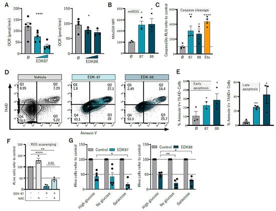 EDK compounds induce mitochondrial damage and apoptosis. (A) HL60 cells were treated for 24 h with EDK–87 or EDK–88 at 5 and 10 µM, and basal oxygen consumption rate (OCR) was analyze using Seahorse. (B) HL60 cells were treated for 24 h with EDK–87 or –88 at 10 µM, stained with MitoSOX, and acquired in a flow cytometer. (C) HL60 cells were treated with 10 µM EDK–87, EDK–88, or etoposide (positive control) for 24 h, and effector caspase activation was measured with CaspaseGlo. HL60 cells were treated for 24 h with EDK–87 or –88 at 10 µM, and apoptotic cells were detected via flow cytometry according to 7AAD and annexin–V staining. (D) Representative flow cytometry plots and (E) frequency of apoptotic cells. (F) HL60 cells were treated for 48 h with EDK–87 10 µM alone or in combination with the ROS scavenger NAC, and viability was assessed via flow cytometry. (G) HL60 cells were treated with 10 µM EDK–87 or EDK–88 for 48 h in high–glucose–, no–glucose, or galactose–containing media, and viability was assessed with flow cytometry. * p < 0.05; ** p < 0.01; **** p < 0.0001 in one-way ANOVA except glucose depletion (two–way ANOVA); mtROS: mitochondrial ROS.
