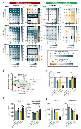 EDK–88 synergizes with ATO in AML cells but not in healthy samples. (A) AML patient samples (n = 3, left) and two healthy donor blood samples (n = 2, right, BC: buffy coat) were treated with combinations of EDK–88 and ATO; viability was analyzed after 48 h with flow cytometry (shown as the frequency of death cells), and synergistic values were calculated (Bliss scores). (B) Cytotoxicity effect of the combination of 10 μM EDK–88 and different concentrations of ATO in AML (red) vs. healthy (green) samples in order to visualize the synergic therapeutic window and the therapeutic index (viability of healthy/AML). (C) Cytotoxic effects of 10 µM EDK–88, 1 µM ATO, or a combination (combo) in AML samples and healthy blood cells (BC). (D) HL60 and MonoMac1 cells were treated for 24 h with 2.5 µM EDK–88, 2 µM ATO, or a combination (combo), stained with Lysotracker, and acquired in a flow cytometer. The mean fluorescence intensity of Lysotracker is represented. (E) HL60 and MonoMac1 cells were treated for 24 h with 5 µM EDK–88, 1 µM ATO, or a combination (combo). OCR was measured with the Seahorse technique. * p < 0.05; ** p < 0.01; *** p < 0.001; **** p < 0.0001 in (B) two–way ANOVA comparing BC and AML, (C) one-way ANOVA comparing inside families, or (D) Welch t–test (E) ### p < 0.001 in two–way ANOVA comparing BC vs. AML.