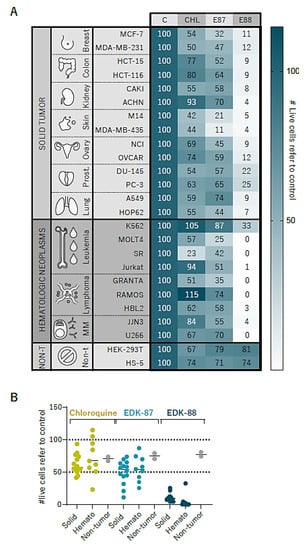 EDK compounds are effective in a pancancer cell line panel. Cancer cell lines were treated with vehicle control (C), 10 µM chloroquine (CHL), 10 µM EDK–87 (E87), or 10 µM EDK–88 (E88), and viability was assessed after 48 h. Experiments were performed in three independent biological replicates; (A) means of 3 experiments. Frequency of live cells normalized to control across cell types. (B) Previous results grouped by solid tumors, hematological neoplasms, and nontumor cell lines. Each point represents the total mean of a cell line.