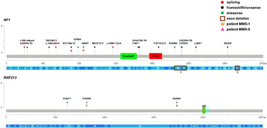 | MMS-6 | F | NF1 c.2131delC (p.Arg711Alafs * 37) RNF213 c.10403C>T (p.Ala3468Val) | P/P/- VUS/-/- | - 1.3 × 10−4 | - 7 × 10−4 |