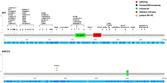 | NF-45 | M | NF1 c.3827G>A (p.Arg1276Gln) RNF213 c.5162C>T (p.Pro1721Leu) | P/P/P VUS/-/- | 1 × 10−5 1 × 10−3 | - 2.7 × 10−3 |
