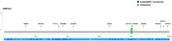 - Guey, S.; Kraemer, M.; Hervé, D.; Ludwig, T.; Kossorotoff, M.; Bergametti, F.; Schwitalla, J.-C.; Choi, S.; Broseus, L.; Callebaut, I.; et al. RNF213 variants in the C-terminal region encompassing the RING-finger domain are associated with moyamoya angiopathy in Caucasians. Eur. J. Hum. Genet. 2017, 25, 995–1003. [Google Scholar]