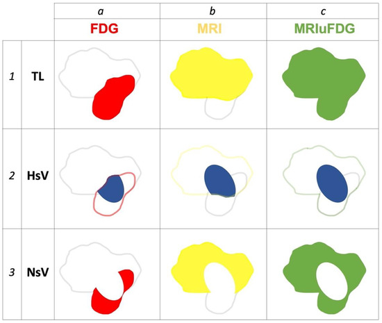 Example of different segmentations obtained from a patient included in the RTEP8-Hyponeck study. Columns a, b, and c represent FDG PET (red), MRI (yellow), and the union of MRI and FDG PET (green), respectively. Lines 1, 2, and 3 represent the segmentations of the tumor lesion (TL; solid color), hypoxic (HsV; blue color), and normoxic (NsV; white color) subvolumes.