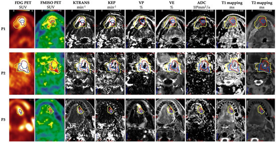 Multimodal PET/CT MRI images obtained from patients 1, 2, and 14 of the RETP8 population. For more details, see patient characteristics in Table 1. MRI tumor segmentation in yellow, FDG PET in red, and FMISO PET hypoxic subvolume in blue on each quantitative PET and MRI series.