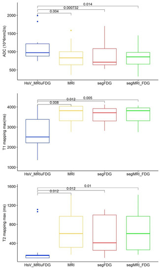 The quantitative MRI parameters between the different normoxic volumes (MRI, FDG, and MRI-FDG) and the hypoxic HsV-MRIuFDG sub-volume were compared via non-parametric Wilcoxon tests for the 13 patients with a hypoxic lesion. The results show statistically significant differences between hypoxic and normoxic volumes for the parameters ADC (p = 0.01), T1 mapping max (p = 0.01), and T2 mapping max (p = 0.01) (Figure 4 and Figure A2). ADC values tended to be higher in the hypoxic volumes than in the normoxic volumes. Conversely, T1 and T2 max mapping values are lower in the hypoxic volume. The other parameters showed no statistically significant differences between the hypoxic subvolume and the normoxic volumes.