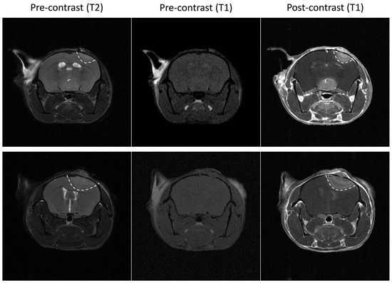 The GL261 model is a syngeneic mouse model of GBM in C57BL/6 mice that do not require a deficient immune system [21]. The infiltrative property of GBM is a key factor for the failure of treatments [22,23], and the GL261 model is particularly suitable to represent this feature [21]. While T2-weighted MRI analysis easily depicts large GL261 tumors, the detection of tumors at an early stage can be difficult [24]. Fortunately, tumor detection can be improved by using contrast-enhanced MRI following the administration of Gd-DOTA, an extracellular paramagnetic contrast agent (Figure 1). In the clinic, this compound is administered intravenously to patients. Here, as the objective was not to gain rapid sequential images to monitor perfusion and permeability parameters [25] but rather to provide early confirmation of tumor presence as well as to assess the tumor volume, our practice has shown that the contrast can be easily obtained using an intraperitoneal injection of Gd-DOTA with images acquired 10 min after the injection.