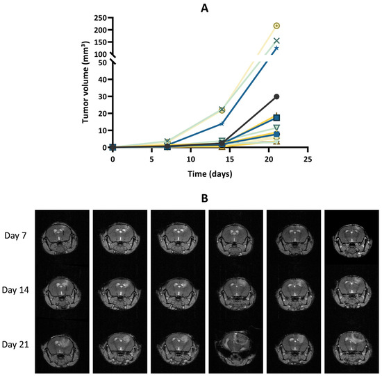 Tumor growth of GL261 tumors that do not express luciferase. (A) Tumor volumes measured by magnetic resonance imaging (MRI). The graph gathers the results of two in vivo experiments (N = 2) with a total of 15 mice (n = 15). (B) Representative T1-weighted images following gadolinium-DOTA administration. Each row represents the longitudinal measurement of tumor growth over time for an individual mouse.