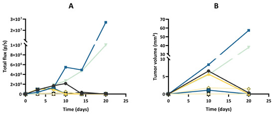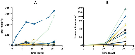 Tumor growth of the GL261-luc-GFP model, evaluated by bioluminescence imaging (BLI) and magnetic resonance imaging (MRI). (A) Evolution of total flux measured by BLI. (B) Evolution of tumor volumes measured by MRI. Each color represents one individual mouse, and the same color is used for the same mouse in both graphs; n = 12. Note that BLI suggested different growth patterns, with rapid growth for a few tumors and regression for most tumors, while MRI revealed that the tumors were present in all cases, even if their extension was variable between tumors.