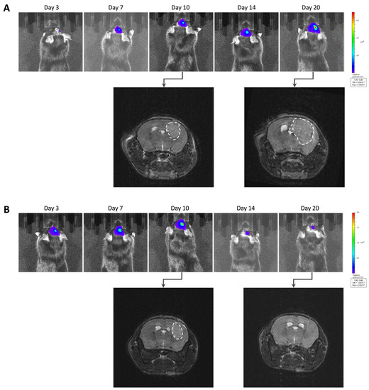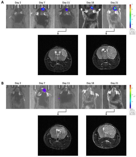 Images of GL261-luc-GFP tumor growth by bioluminescence imaging (BLI) and magnetic resonance imaging (MRI). (A) Representative images of a tumor’s growth with consistent data observed with both BLI and MRI. (B) Representative images of another case where BLI showed signal decrease over time, suggesting a regression, while MRI showed that the tumor was actually growing.