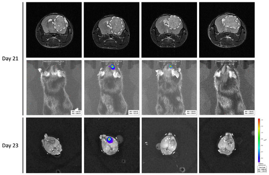 To confirm the unexpected observations following GL261-luc-GFP implantation, we performed ex vivo BLI measurements after the sacrifice on Day 23. In Figure 7, we present illustrative results obtained in mice where MRI images are compared with BLI obtained in vivo and ex vivo just after the sacrifice. While the GBM tumors were MRI-visible in most mice, there was an absence of light emission both in vivo and ex vivo in most cases.