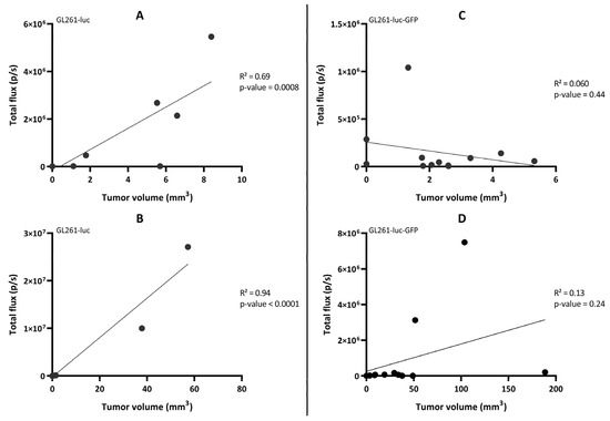 Correlation between the total flux (measured by bioluminescence imaging) and the tumor volume (measured by magnetic resonance imaging) in the GL261-luc mouse model (left panel) on Day 10 (A) and D20 (B) and the GL261-luc-GFP mouse model (right panel) on Day 11 (C) and Day 21 (D). n = 12 mice in each model. Statistical analyses were performed using simple linear regression. An enlargement of the region with low light radiance flux for each panel is presented in Figure S4.