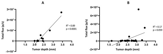 Correlation between the total flux measured by bioluminescence imaging and the tumor depth measured by magnetic resonance imaging in the GL261-luc (A) and GL261-luc-GFP (B) models. n = 10 (A) or 21 (B). Statistical analyses were performed using simple linear regression.