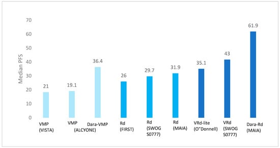 Thus, an adapted VRd version was introduced called “VRd lite” [11] in order to reduce the toxicity associated with this regimen. VRd lite was given over a 35-day cycle (based on the VMP scheme) with oral lenalidomide 15 mg on days 1–21, bortezomib subcutaneous 1.3 mg/m2 on days 1, 8, 15, and 22, combined with dexamethasone 20 mg for nine cycles, followed by six cycles of consolidation by VR, similarly to the initial VMP design. Median PFS was 35.1 months (95% CI 30.9; ∞) (Figure 1) and median OS was not reached at a median of follow-up of 30 months. There is also a “VRd lite” version given over a 28-day cycle (as per the Rd scheme) with oral lenalidomide 25 mg on days 1–21, bortezomib subcutaneous 1.3 mg/m2 on days 1, 8, and 15, combined with dexamethasone 20 mg for up to six to twelve cycles followed by Rd maintenance treatment.