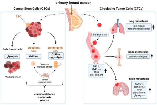 CSCs and circulating tumor cells CTCs are responsible for tumorigenesis, chemoresistance, metastasis, and relapse [44,45]. In primary tumors, the majority of cancer cells are highly proliferative, differentiated, non-stem cells. In contrast, CSCs are a rare population (<1%) of cancer cells harboring an undifferentiated, slow-cycling phenotype, with self-renewal and tumor-initiating capacities [46,47,48,49]. These cells show distinct metabolic preferences; the bulk breast cancer cells rely on glycolysis, while quiescent breast CSCs depend on OxPhos, and proliferating CSCs utilize both OxPhos and glycolysis. CSCs also utilize metabolites generated from tumor stromal cells in what is called a “Reverse Warburg effect” [37,50,51,52,53] (Figure 1, left). OxPhos is shown to be critical for breast CSCs function [54,55,56,57,58,59,60,61,62,63]. For instance, inhibition of OxPhos by depleting mtDNA reduced an anchorage-independent survival and propagation of breast CSC-like cells [55,56,57,58]. MtDNA in exosomes mediates endocrine therapy resistance [59]. Samples from chemoresistant TNBC showed high dependency on OxPhos [60,61].