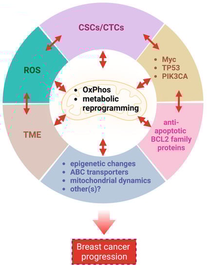 Mitochondria are critical for breast cancer progression. Mitochondria support breast cancer progression via multiple interrelated mechanisms. CSCs: cancer stem cells; CTCs: circulating tumor cells; ROS: reactive oxygen species; TME: tumor microenvironment; PIK3CA: phosphatidylinositol-4,5-bisphosphate 3-kinase catalytic subunit alpha; ABC: ATP-binding cassette. This figure was generated by BioRender.com (19 January 2023).