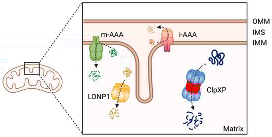 The member of AAA+ protease family in human mitochondria. ClpXP and LONP1 are located in the mitochondrial matrix, the i-AAA and m-AAA are located in the inner mitochondrial membrane. OMM: Outer mitochondrial membrane; IMS: intermembrane space; IMM: inner mitochondrial membrane. This figure was generated by BioRender.com (19 January 2023).