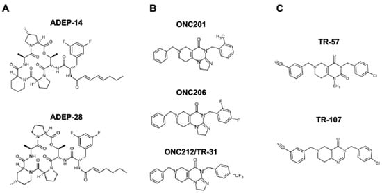 Since ClpP activators, but not ClpP inhibitors, show cytotoxicity in breast cancers, we will focus on ClpP activators in this review (for ClpP inhibitors, we refer readers to other excellent reviews [233,264,266]. There are three classes of ClpP agonists: acyldepsipeptide antibiotics (ADEPs), ONC201 and its analogs (imipridones), and TR compounds. The representative ClpP agonists and structures are illustrated in Figure 5.