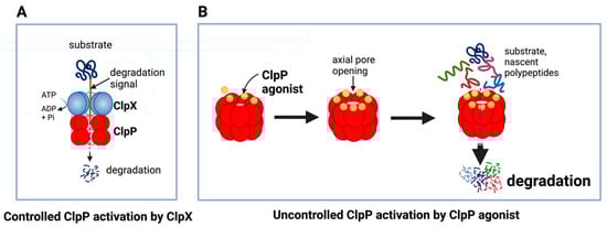 Controlled and uncontrolled proteolysis by ClpP. (A) In controlled proteolysis, target substrates are specifically recognized and unfolded by ClpX. The unfolded substrate is transferred into the barrel-like chamber of the ClpP, and proteolysis is carried out by active proteases at the inner surface of the chamber. (B) Uncontrolled proteolysis triggered by binding of ClpP agonists to ClpP. Binding of ClpP agonists (yellow spheres) to ClpP subunits displaces ClpX and triggers an opening of the entrance pore of the ClpP barrel, leading to unregulated degradation of nascent polypeptides and unfolded proteins. This uncontrolled ClpP activation does not require ClpX. This figure was generated by BioRender.com (20 January 2023).
