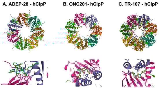 Crystal structures of human mitochondrial ClpP complex with ClpP ligands. (A) ADEP-28-hClpP binding [283] (PDB DOI: 10.2210/pdb6BBA/pdb), (B) ONC201-hClpP [271] (PDB DOI: 10.2210/pdb6DL7/pdb), (C) TR-107-hClpP [294]. (PDB DOI: 10.2210/pdb7UVU/pdb). Top panels show that each ClpP ligand (bright green) bound to ClpP. One heptamer ring for ADEP-28 and ONC201, or two heptamer rings for TR-107 are shown. Each subunit of ClpP is shown in a different color. Bottom panels show a magnified view of ligands (bright green) bound to the pocket between two ClpP subunits.