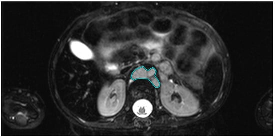 Axial T1-weighted image of a 2-year-old patient with stage IV neuroblastoma. The tumor is located para-aortally. The region of interest (ROI) is shown in turquoise, drawn using the “closed polygon” tool.