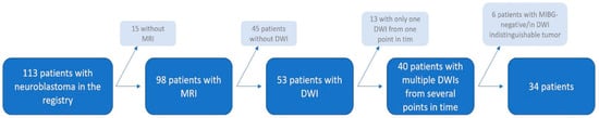 The neuroblastoma registry of the Clinic for Pediatrics and Adolescent Medicine at the University Medical Center, Greifswald, included 113 patients. Imaging was not available for 15 patients. Of the 98 patients with available imaging, 45 patients were excluded because no diffusion-weighted images were available. A further 13 of the remaining 53 patients were excluded because the diffusion-weighted images were only available from one study time point. A further six patients were excluded because the tumor-suspected lesions could not be evaluated with certainty due to their size in the diffusion-weighted images or because the lesions in the MIBG scintigraphy were negative; thus, 34 patients remained available for the final analysis (see Figure 2).