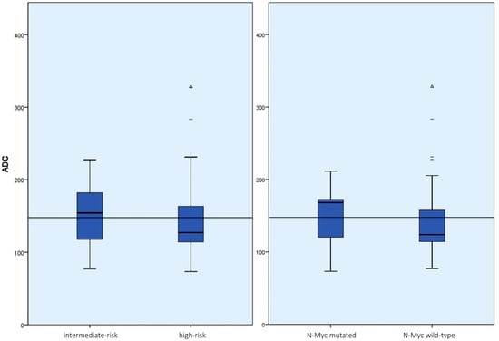 Boxplot representation of the ADC values of the tumor manifestation divided into INRG risk groups (left) and N-Myc status (right) with the mean of all measurements plotted as a reference. While the ADC values as a function of N-Myc status did not differ significantly (p = 0.2), the difference in ADC values for the INRG risk groups was statistically significant regardless of the location of the tumor (p = 0.02). (dashes = mild outliers; triangles = extreme outliers).