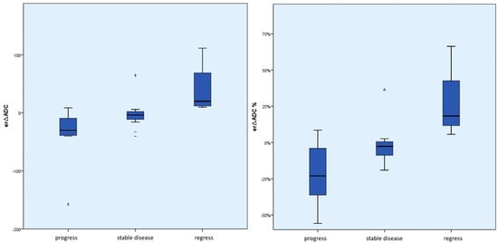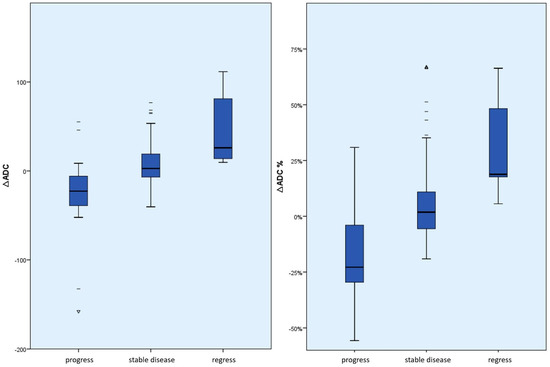 Box plot of the absolute or percentage ∆ADC values according to the course of the disease. This shows an absolute and relative ADC increase in tumor regression compared to stable disease and tumor progression or an absolute and relative ADC decrease in tumor progression compared to stable disease and tumor regression. In particular, there were no negative ∆ADC values in the case of tumor regression. (dashes = mild outliers; triangles = extreme outliers).