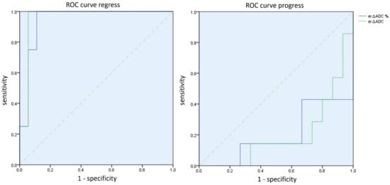 ROC curves of the absolute (green) and percentage (blue) er∆ADC values for regress and progress prediction. It is shown that both an ADC decrease as a parameter in tumor progression and, in particular, an ADC increase as a parameter in tumor regression have a high ability to discriminate.