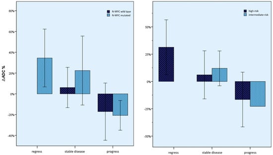 Mean percentage ∆ADC values (whiskers = 1 SD) by N-Myc status and by INRG risk groups. Significant differences could not be seen here between the changes depending on the N-Myc status or the INRG risk group.